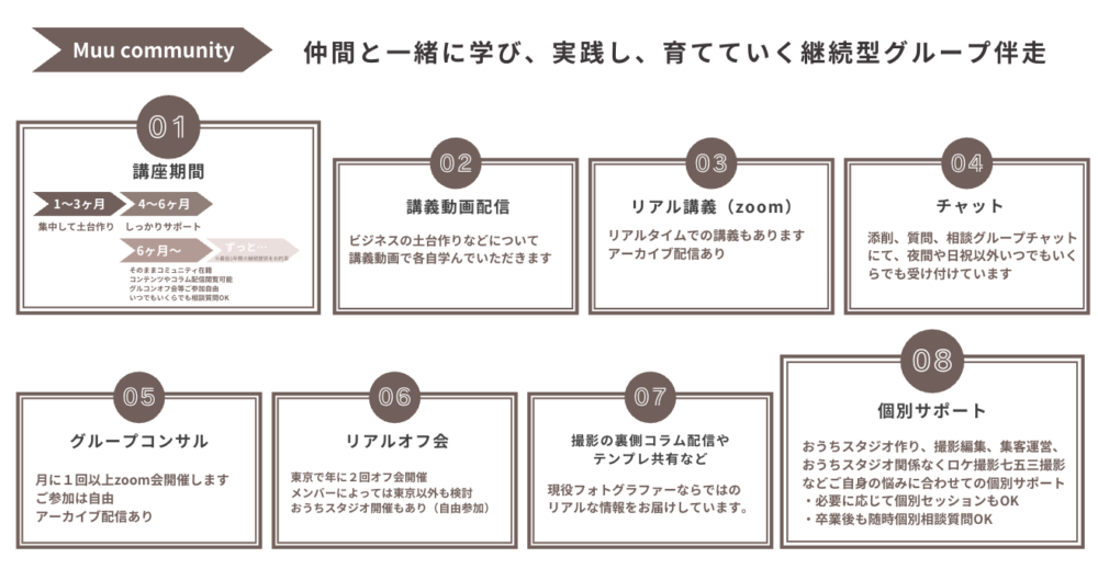 写真技術をお伝えするとかビジネスの基本からお伝えするという講座ではなく、あくまでも両方ともどこかしらでなんとなくでも学ばれていたり、これまで活動をしてこられてある程度の土台があり、ある程度自走されている方を対象としたコミュニティです。