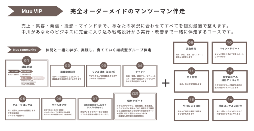 売上・集客・発信・撮影・マインドまで、あなたの状況に合わせてすべてを個別最適で整えます。中川があなたのビジネスに完全に入り込み戦略設計から実行・改善まで一緒に伴走するコースです。