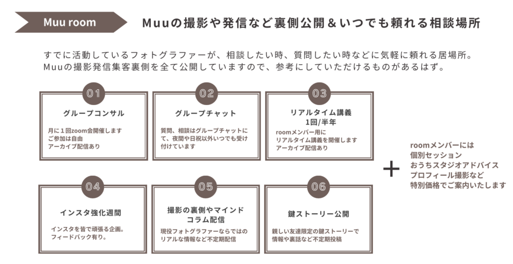 そこで、フォトグラファーとしても、講師としても活動している私に、必要なときだけ気軽に相談できる場所としてMuu roomを作りました。